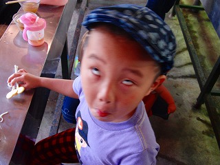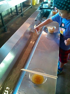 ステンレスの流しで4歳のチビも食べやすそうでした